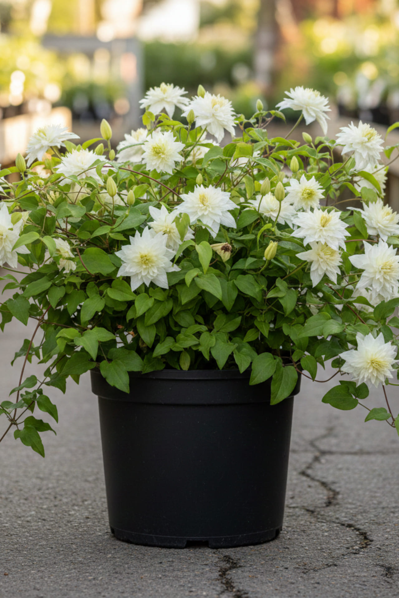 Позднецветущий сорт с чисто-белыми цветками со светло-жёлтыми тычинками. Цветёт обильно VI-VIII. Растёт умеренно сильно, лучше испольовать на тёмном фоне.