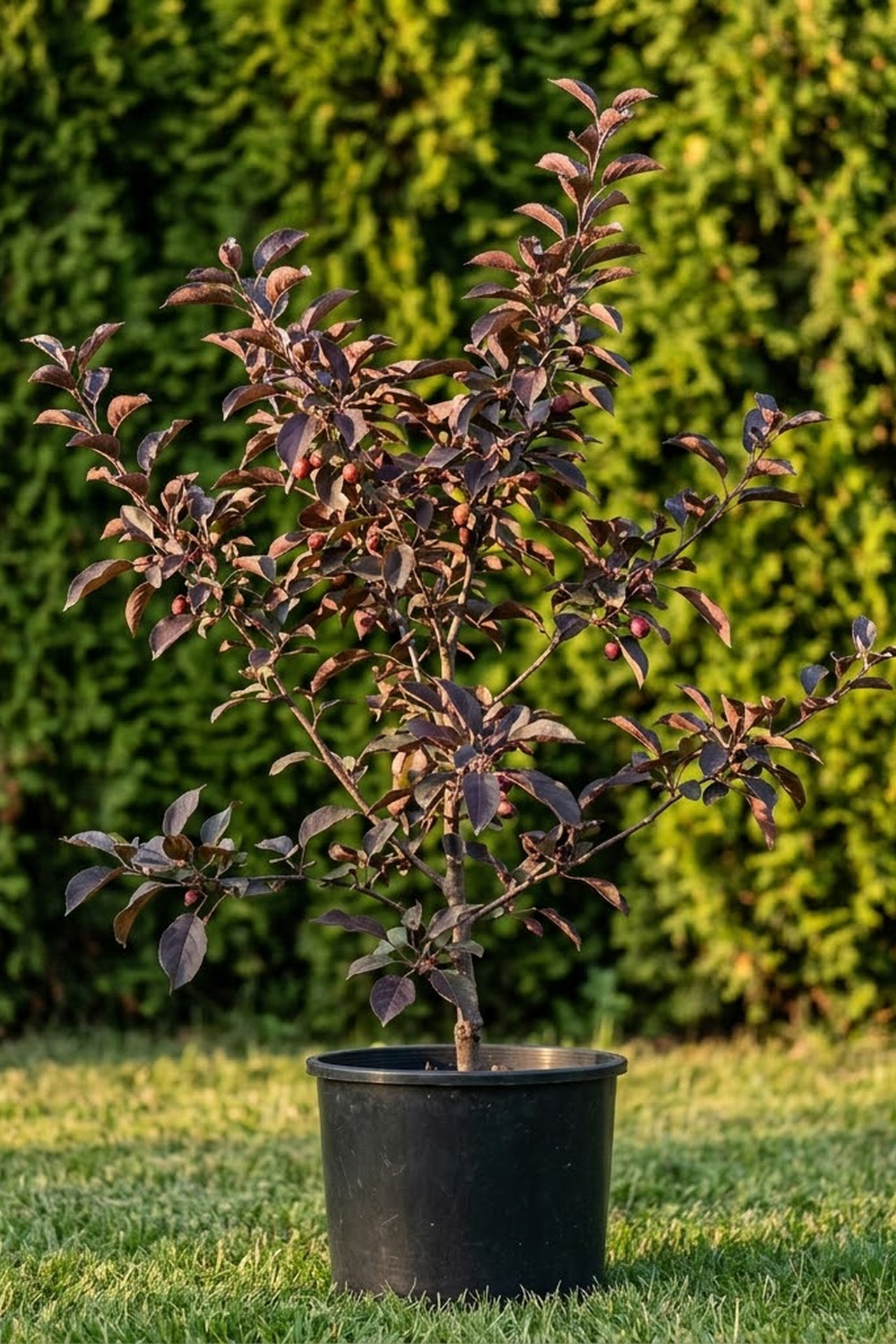 средних размеров с темно-зелеными листьями с лиловатым отливом и розовато-красными цветками, на месте которых образуются красно-каштановые плоды. У гибрида декоративной яблони «Изобилие» нежно благоухающие винно-красные цветки собраны по 6-7 в кисти. Глянцевые листья яблони «Царственность» каштаново-красного цвета, а простые цветки - рубиново-красные; мелкие плоды - темно-красные.